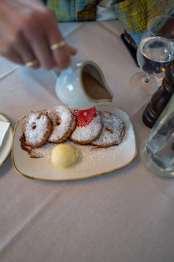 Nach einem ereignisreichen Tag meldete sich unser Magen und wir freuten uns auf ein Abendessen im Wintergarten. Vom Gedeck mit frischem Brot über einen knackigen Salat und Steirischen Schafskäse, bis hin zu Fisch und Fleisch – das Menü ließ keine Wünsche offen. Zum krönenden Abschluss des Abends durfte natürlich eine Nachspeise nicht fehlen. Wir entschieden uns für traditionelle Apfelradl‘ mit Vanilleeis, die uns an die Köstlichkeiten unsere Oma erinnerte. Der Kellner, seit Jahren die Seele im Haus, sorgte mit seinem charmanten Humor für gute Laune und verwöhnte uns mit den delikaten Speisen.