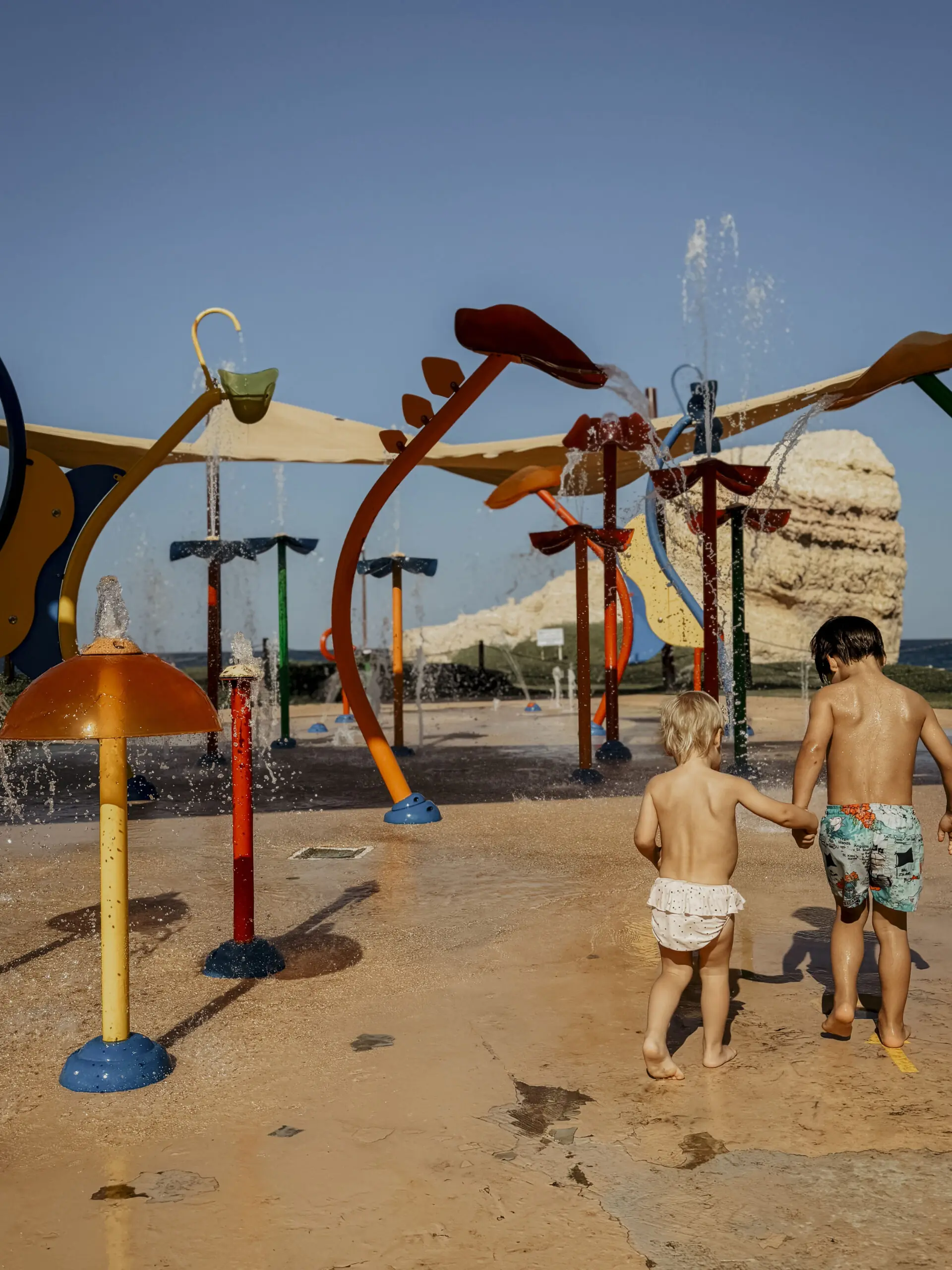 Ein Pritschel- und Planschparadis in dem Kinder nach Herzenslust einfach Kinder sein dürfen. Während sich unsere Kleine zuerst zaghaft, dann immer mutiger durch die vielen Fontänen und Regenduschen bewegt, erkundet unser Junior ein altes omanische Holzboot, das für eine Weile zur Piratenfestung seiner Träume wird. Anschließend wird die Wasserrutsche ausgiebig getestet, bevor er sich im Surferstil gegen die brechenden Wellen des Meeres wirft. Lachen, Plätschern, Sonne auf der Haut – so fühlt sich Kindheit an.