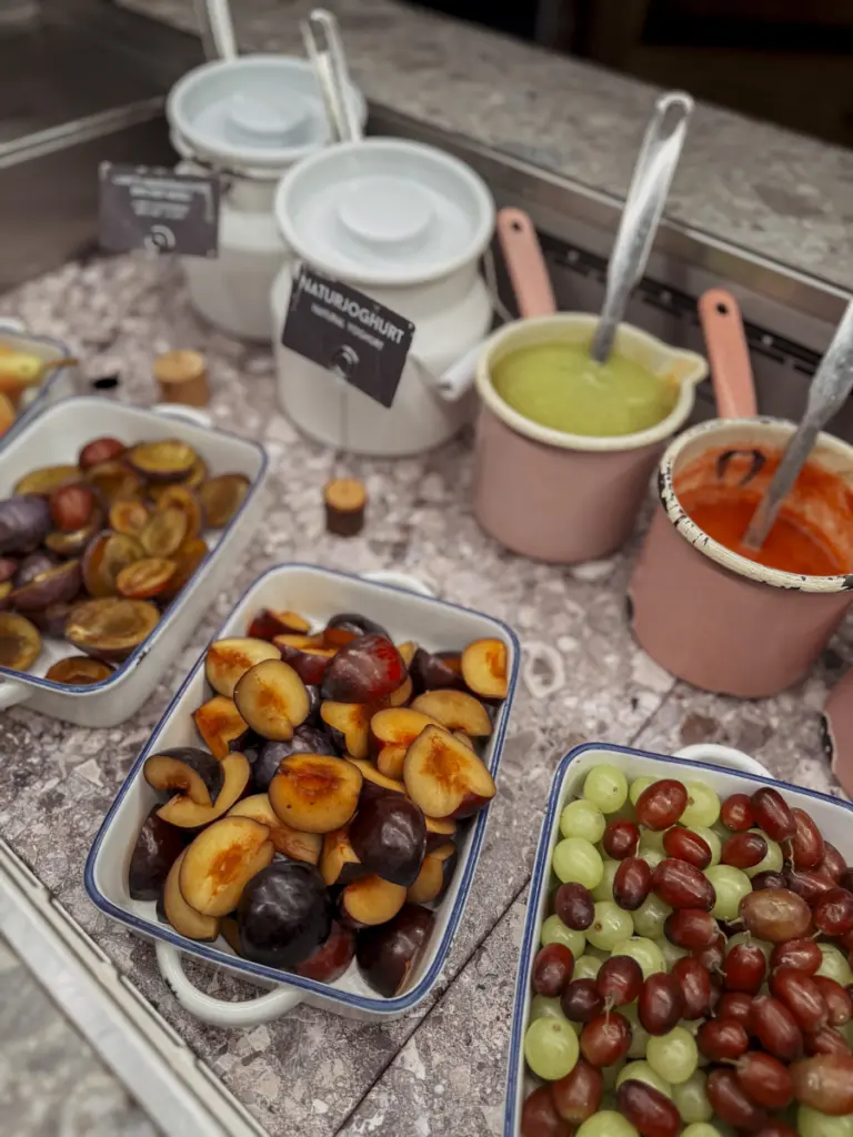 Ob an der Barschaukel einen Drink genießend, am aus alten Nähmaschinen gezimmerten Shuffleboard wettstreitend, auf den Sesseln der Galerie lümmelnd oder beim Yoga unter beinahe freiem Himmel im „Weitblick“, dem multifunktionalen Veranstaltungsraum mit komplett zu öffnendem Dach – wir fühlen uns einfach wie zuhause. Das Highlight für Youngsters ist die gemauerte Rutsche im „Freiraum“. Für uns Erwachsene ist es das Gefühl, durch das terrassenartig angelegte „Wohnzimmer“ mit seinen riesigen Fensterflächen immer den Platz mit der besten Aussicht zu ergattern – zum Dinieren oder zum Entspannen. Um uns herum spielende Eltern mit Kindern, kuschelnde Paare und Freundesgruppen – so, wie es in Jedermanns Wohnzimmer sein sollte.